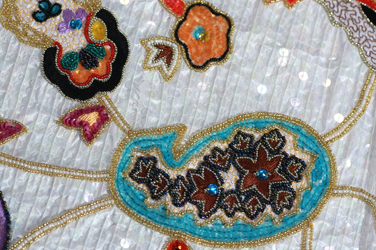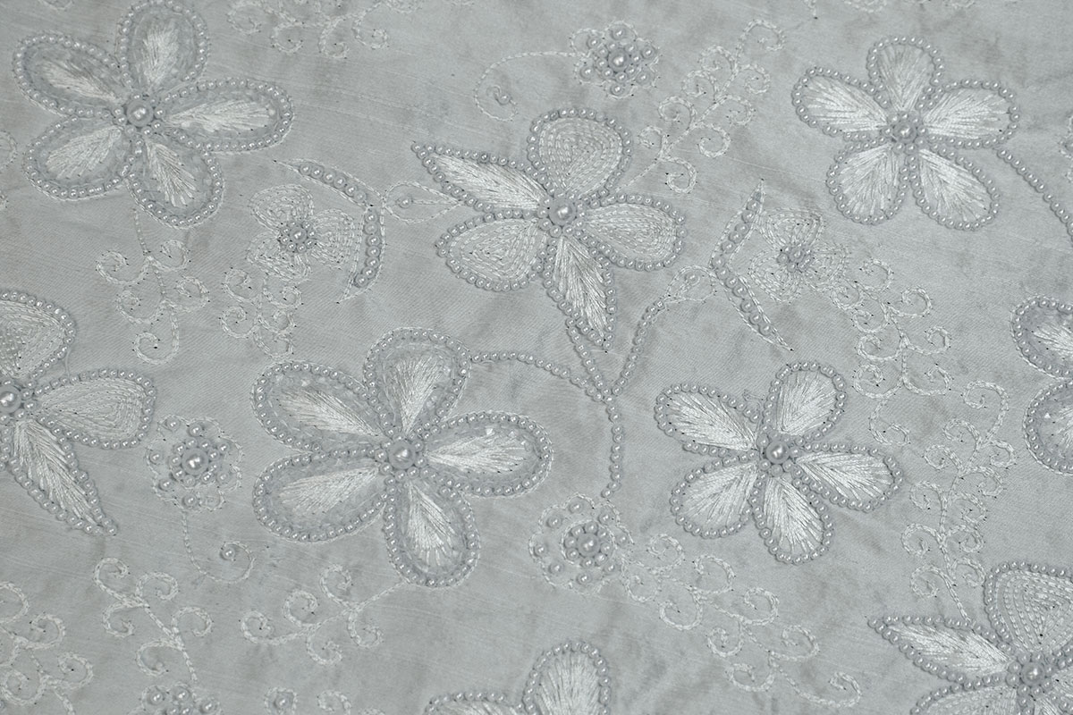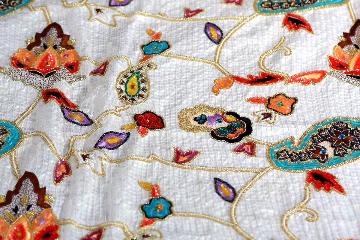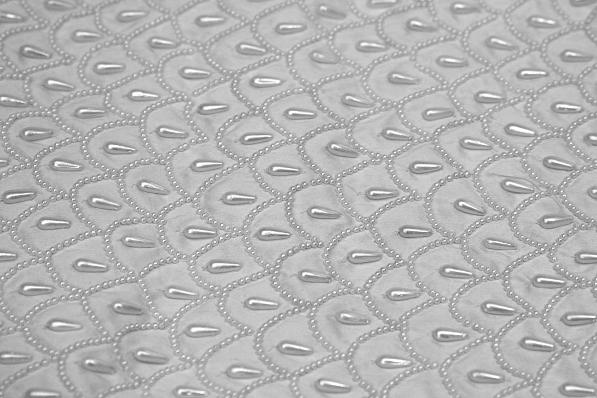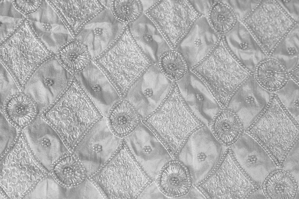 Pärlbroderi, samt silverlamé. Unikt. Mycket exklusivt till brudens fantastiska drömklänning. Även till fest kavaj, korsett, scenkläder samt kuddar och sängöverkast, etc.
